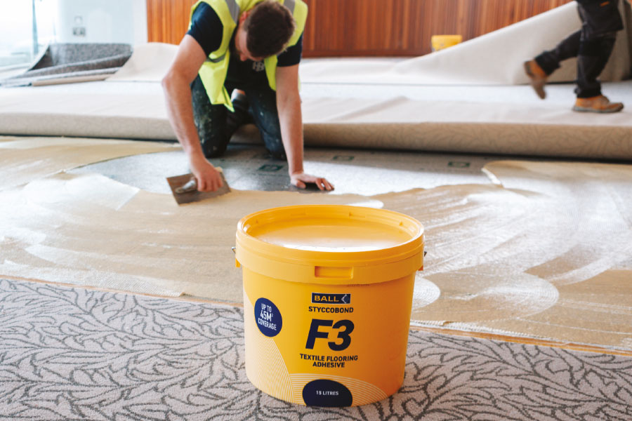 Contractors then installed Wilton carpet in the entrance areas using a dual bond system. This involved using F Ball’s Styccobond F3 to create a permanent bond between carpet and underlay, with the company’s Styccobond F40 providing a peelable bond between the underlay and subfloor.