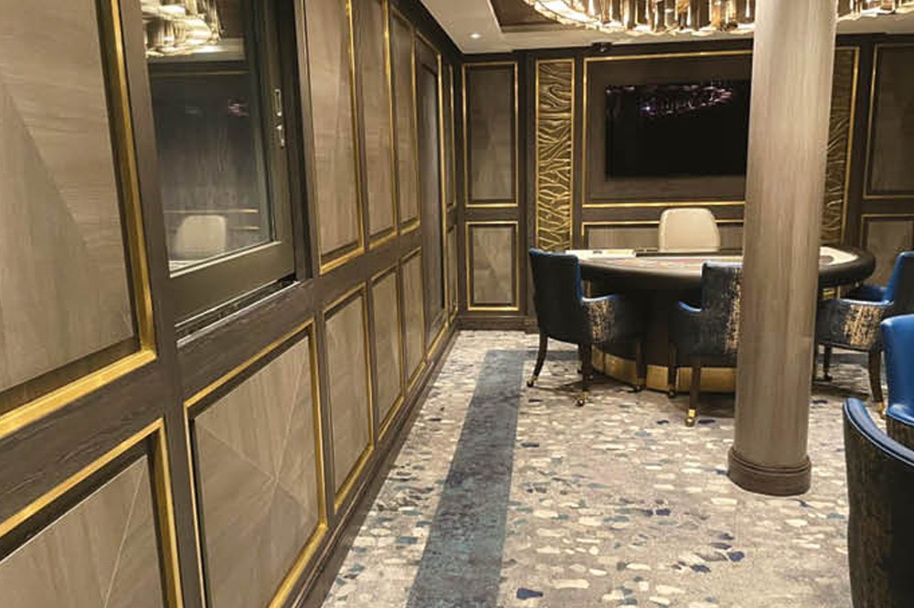 The project demanded the highest level of workmanship and materials to install luxurious carpeting throughout public areas of the ship, including the Palm Court and Crystal Cove entertainment areas, Waterside restaurant, and the Sea Casino.