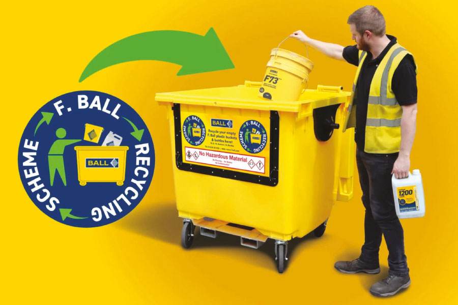 F Ball plastic buckets and the company’s five and 20 litre plastic bottles used for liquids, primers and tackifiers can be recycled via the scheme, with much of the packaging itself manufactured from recycled materials.