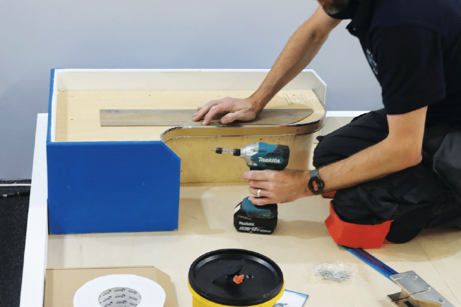 The challenge at this year’s final contained four different LVT elements. The first was a hexagonal shaped area to be installed with a Kraus Herringbone click tile provided by Roberts QEP. The second was to install Textures Elements basketweave, splitting the area in half so one side was done as straight lay and the other on a 45deg angle in mahogany and white ash. The third element was to install herringbone with a border using a new dry-back SPC product from KC-CP in a beautiful honey oak colour. The fourth element was the feature step which was also fitted with the honey oak in the matching plank option and a Bendybull profile supplied by Stairrods UK.