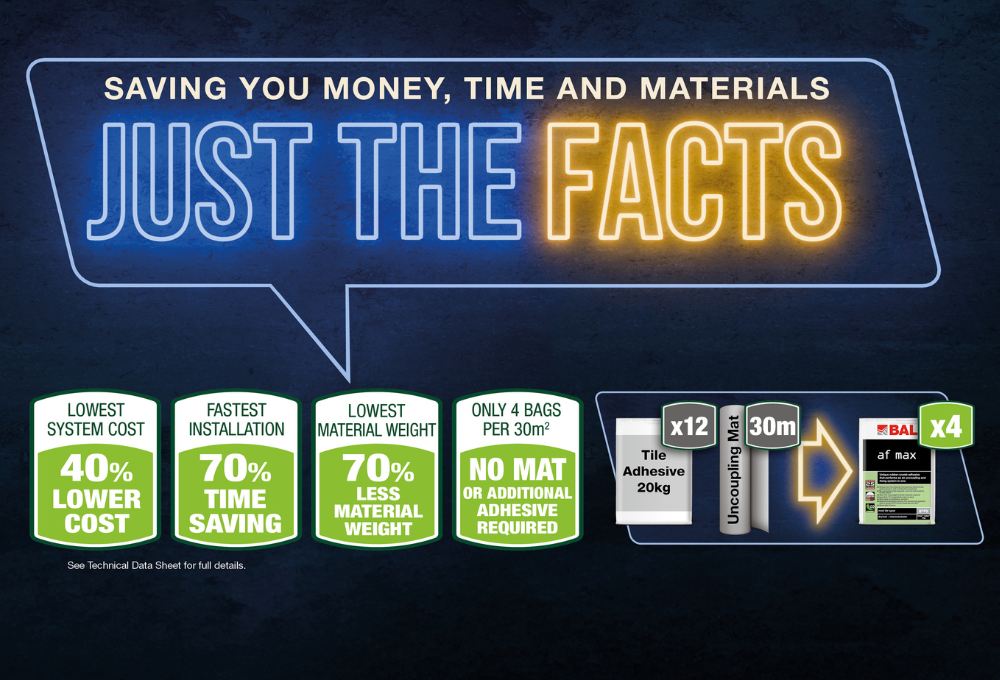 BAL have calculated that based on a 30m2 install (the average length of a roll of uncoupling mat), BAL AF Max will save fixers and contractors approximately 40% in material costs, 70% in time saving and 70% less material weight.