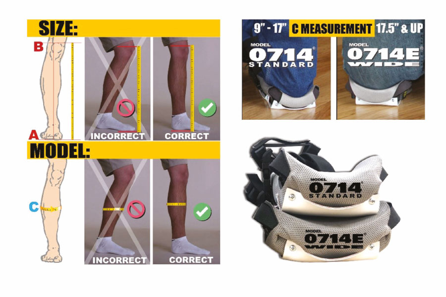 3 Measure around the widest part of your calf muscle with work pants on. The kneepad model (0714 Standard vs. 0714E Wide) is related to your knee width and determined by the C measurement.
