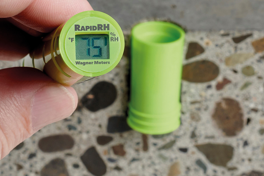 Drilling small holes into the concrete and inserting probes at 40% of the slab’s thickness provides ambient condition and RH readings that let you predict how moisture in the slab will act after a floorcovering has been installed.
