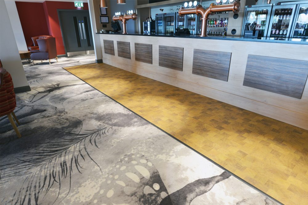 Contractors opted for Polyflor Expona Endgrain vinyl planks, which create the appearance of wood blocks, in the areas in front of the bars in the eatery, private members bar and function room.