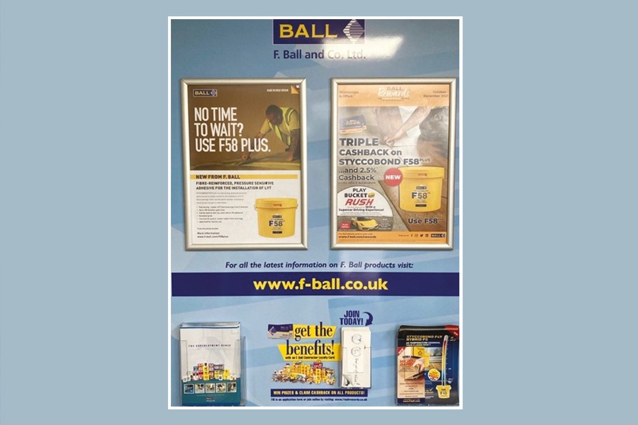 F Ball & Co also supplies posters detailing the latest offers and product promotions, helping flooring contractors to make the most of benefits of membership of its Ball Rewards loyalty scheme, including cashback on purchases of all F Ball & Co products, extra cashback on promotional products, and access to exclusive competitions.