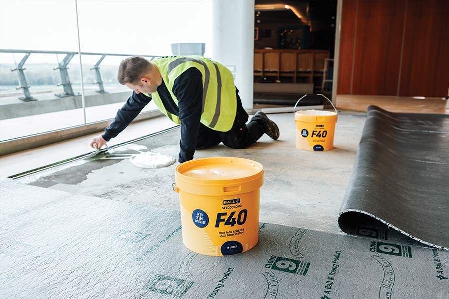 Contractors installed Wilton carpet in the entrance areas using a dual bond system. This involved using F Ball’s Styccobond F3 to create a permanent bond between carpet and underlay, with the company’s Styccobond F40 providing a peelable bond between the underlay and subfloor.