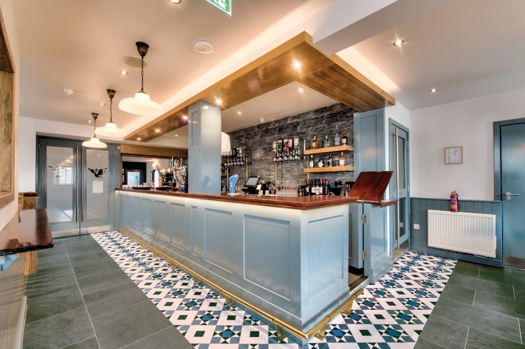 The Swan at Banton is a thriving shared community enterprise at the heart of village life and features a selection of oak, slate, and porcelain Karndean designs that reflect the stunning local landscape and the history of the building. In its family friendly bar area, a bespoke floor has been designed using a striking geometric pattern from our Heritage Collection to highlight the serving area. The clear contrast visually defines this activity zone and picks out the blue tones of the surrounding slate design flooring and the blue-grey paintwork of the bar.