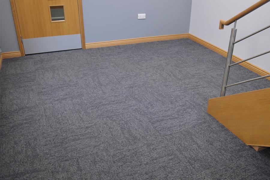 The flooring installation work was planned/designed by the client Tim Bradbury and Blackberry Hill Carpets. The carpet tiles chosen for this office interior were Rawson’s Riven structured solution-dyed nylon tile in colour Rock.